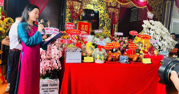 Lễ vật dâng cúng giỗ Tổ của Hoa hậu Thuỳ Tiên xuất hiện tại buổi lễ của công ty Sen Vàng